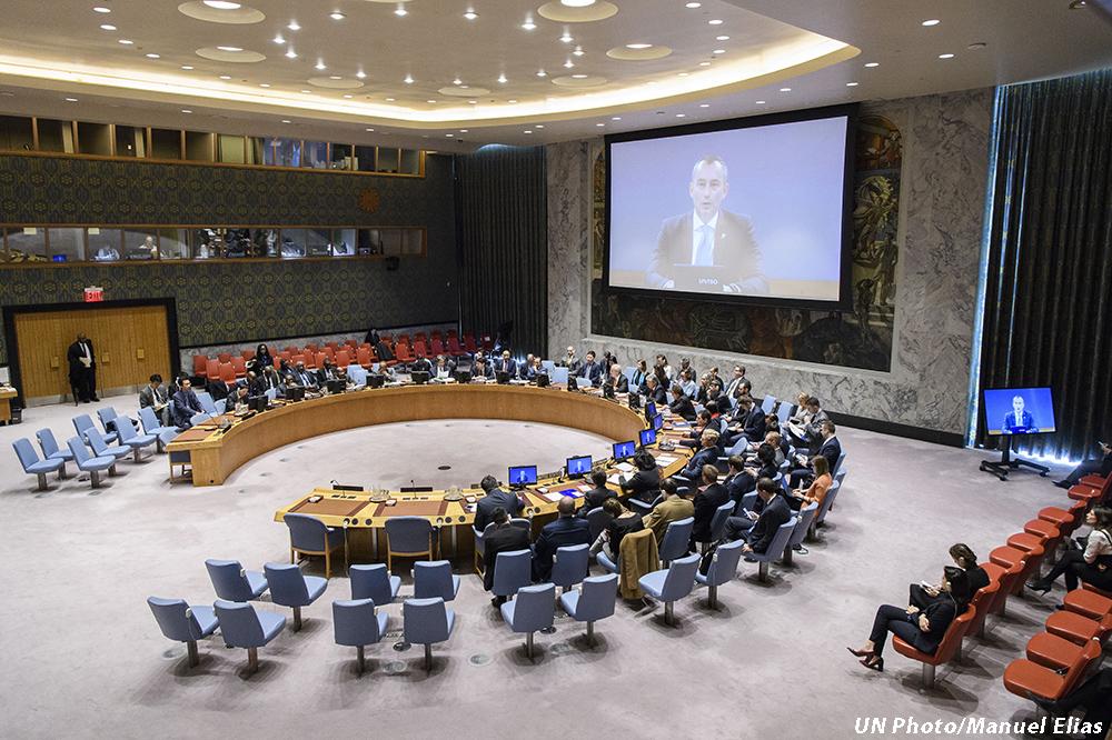 Nickolay Mladenov (on screens), UN Special Coordinator for the Middle East Peace Process, briefs the Security Council meeting on the situation in the Middle East, including the Palestinian question - 26 March 2018