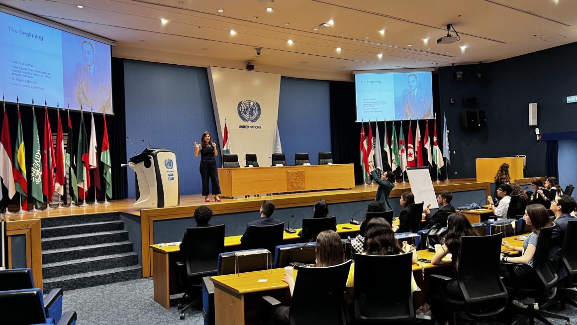 Later, UNSCOL experts, Ms. Pascal El-Kassis and Mr. Alaa Abdelaziz, briefed the students about the beginnings of UN diplomacy and conflict prevention, before leading them through a scenario-based session on negotiation and conflict resolution, blending diplomacy with real-life complexities. It was a simulated but serious exercise, reflecting the difficult conversations that often unfold behind closed doors in international negotiations, using examples grounded in the Lebanese context.